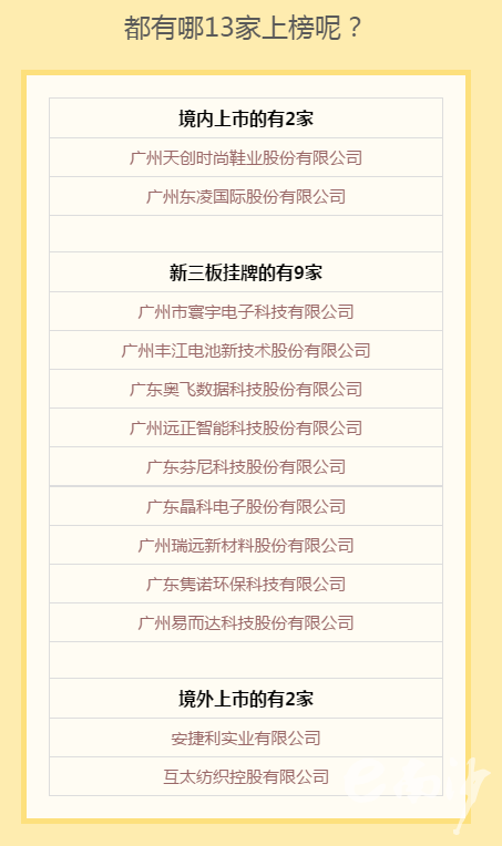 據了解,廣州易而達科技股份有限公司成功上市后,南沙目前上市掛牌企業(yè)已經增加至13家。其中,有兩家企業(yè)在國內主板上市,兩家企業(yè)在香港上市以及9家中小企業(yè)在新三板掛牌。(記者舒霞)
