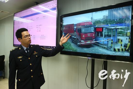 檢驗(yàn)檢疫工作人員在介紹智檢口岸系統(tǒng)。